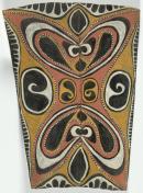 Iconography: Teeki totem. The painting depicts the black millipede. Two heart-shaped representations of the millipede's face (head) shown twice, once in the upper half of the bark and once in mirror reflection, in the lower half. Each face is outlined by a heart-shaped solid white line.