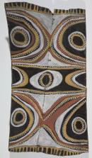 The painting depicts a small black water beetle that moves in zigzag manner across the surface of forest pools. The insect is shown twice: once in the upper and the lower parts of the painting. The pairs of roundels represent the eyes, the black half-roundels outlined in concentric red, yellow and white semicircles that enclose each eye depict the insect’s wings. The black roundel outlined in white and yellow in the centre of the bark represent the insect’s prominent ‘anal orifice’
