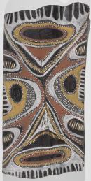 The painting depicts waves generated on the Sepik River by strong winds. Kwoma artists often anthropomorhise natural objects and give them human faces or features of faces. The artist identified two black roundels on either side of the midpoint of the design as the waves “eyes’. Two large black ovoid shapes at the top and bottom of painting depict the ‘source’ of the waves below the surface of the water. The waves are represented by the various U- or V-shaped lines or bands painted in different colours.