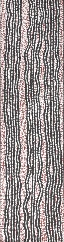 This painting depicts designs associated with the swamp and rockhole site of Marawa, just to the west of Lake Mackay. In mythological times a large group of Tingari men visited the area to drink at the waterhole.