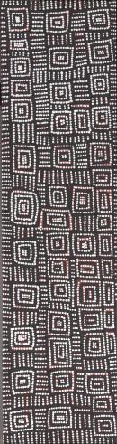 This painting depicts designs associated with the rockhole and soakage water site of Karrilwarra, south west of Kiwirrkura community. The Snake Dreaming travelled to this site from the east and then continued further west. A group of Tingari men also visited the site during their travels further west.