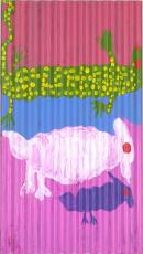 Peggy Napangardi Jones’s aesthetic is renowned for its bold colouration and loosely constructed figures, often simple in composition but daringly audacious. Here, the Warlpiri artist has figuratively depicted two cockatoos and a green goanna, adorned with yellow polka dots. Napangardi Jones was born north of Tennant Creek, and in 1970 moved to the town with her husband. It was in 1996 when she would begin to paint, drawing on her experiences travelling with her family in her youth to construct playful compositions that celebrate Country.
