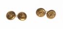 A pair of gold coloured cufflinks, comprising of two buttons with a connecting metal link. The surface features a raised sculpted lion's head framed with a smooth round border.
