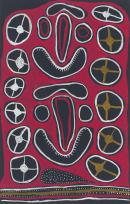 The painting depicts faces of larvae named Wachii ow found in bread fruit (wachii) trees, surrounded by representations of edible bread fruit seeds.