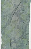 Long sculptural length in two sections made from Korean hand made ramie with insertions of silk organza and embellishments of jade bracelet beads. One section of hand printed fabric features imagery of the silhouette of the branches of cherry blossom trees during Spring in green and blue. The other shows printed imagery of the paper spoon covers from a 'fusion statement' (East/West) in lime and pale green dye.