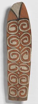 The oblong shaped shield decorated with two rows of red and white scroll works. Asmat people use three colours: white, red and black. White paint called mbi is made from mussel shells; red paint called wasah is taken from the ground and burned before used, while black colour called sosak is made from crushed charcoal obtained from the fire. These colours are thought to contain magical properties.