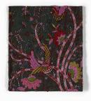 Inspirational Piece: Beaded Indonesian batik. Square of folded fabric in dark forest green and printed batik sewn together by running stitches in red cotton around the outside edge. The surface is encrusted in opalescent beading imitating the batik illustration below. The beading depicts perched birds, sprawling vines and trumpet shaped flowers in a combination of pale pink, gold, green, red, yellow and clear beads. The densely clustered beading creates a 3D surface texture.