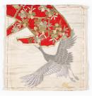 Inspirational Piece: Wedding kimono. The Wedding Kimono is of unpicked, cream silk jacquard with silver, gold and bronze embroidery detail. The kimono is folded to form a square parcel with embroidery details exposed on both front and back. The front panel features a dense segment of embroidery in silver metallic thread depicting a large winged crane in flight. A second design shows a cluster of pale gold and bronze flowers in metallic thread against a background patch of dense red needlework. Around the edges is a border of hand sewn wide loose red running stitches.