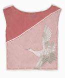Actual Piece: Shift dress, 1998-99 (spring/summer). The shift dress is of bias cut ivory silk organza with red habotai silk half lining. The garment is folded in a loose square parcel with the front face showing the upper section of the dress from the rounded neckline to the waist. This face is folded to expose contrasting single and double layers of the ivory organza over the red lining at a diagonal angle from the shoulder seam to the hemline. In the (facing) right corner of the garment is a feature detail of a crane in densely executed silver metallic thread embroidery. A border of wide loose red running stitches follows the outside edge of the garment. The reverse face is a pattern of contrasting colours formed by the effect of layering folds of the dress. Border stitches appear in red cotton around edges.