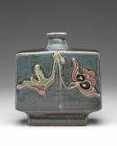 During the twentieth century, Kawai Kanjirō was one of the main artists responsible for preserving ancient Japanese ceramic techniques and historical folk aesthetics. He also developed his own distinctive style, which continues to inspire ceramicists today. Working with a climbing (dragon) kiln in Kyoto, Kawai produced simple, traditionally influenced slab-moulded bottles, vases, boxes and dishes. Created using flat pieces of clay shaped by moulds, his works feature a decoration style of raised lines and smooth areas of glazed colour. Kawai’s interest in Buddhist traditions can be seen in this vase’s decoration of stylised blossoming flowers, like those often found in the hand of a compassionate bodhisattva (enlightened being).