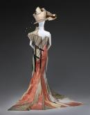 This work was commissioned by the NGV in 2000 from John Galliano’s controversial spring–summer 2000 collection, christened ‘hobo couture’ by the press. With its references to squalor and homelessness, the collection was poorly received. What was not understood was that Galliano was also referencing nineteenth-century rag balls, where French aristocrats dressed up as the poor. Made to look tattered, with raw seams, paint splatters and protruding boning, Look 39 simultaneously deconstructs nineteenth-century corsetry and the historicism of the New Look that it inspired. The look is completed with this extraordinary gestural hat by Stephen Jones, who has been milliner to the house since 1996.