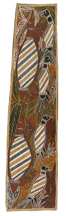 This bark painting shows Milpurrurru’s bold and dramatic drawing style, in which outlines and emphatic rarrk are an integral part of the composition. The artist depicts spiny anteaters and gurramattji (magpie geese), totems of the Ganalbingu people associated with the Arafura wetlands.