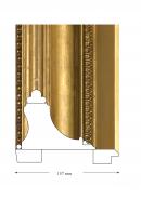 The frame is built from a large timber profile with a run of composition shield and dart ornament to the sight edge and a run of pea and string to the back edge. The corners and centres are cross-banded with composition straps. The inner mitres of the scotia are covered with condensed acanthus leaves. The bead is burnished while the rest of the surface appears to be matte, with a size layer. The slip is located with spacer blocks without being let into a rebate. The working edge is slightly tapered to the back. The structure is mitred and braced on the reverse, including a cover strip across the corners of the slip.