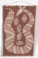 This painting reveals the artist's precise cross-hatching method and confident usage of blocks of differently coloured earth pigments to depict Ngalyod (along with 5 eggs) in a hybrid or transformative state.