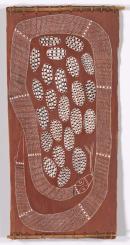The work depicts a serpent with twenty three eggs. It is characteristic of Kunwinjku style that it is unadorned emerging from a plain red surface. Two shades of red and white pigment are utilised.