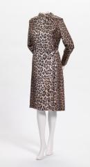 Ocelot print silk dress with long sleeves, rolled collar and matching belt tied at the waist. Fasten with a zip at centre back and short zips at sleeve cuffs. Finishing below the knee, the dress is lined in beige silk.