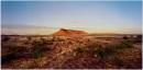 Dawn, light has hit distant mountain, mountain orange/red in colour, red coloured furniture arranged in centre middle-foreground.