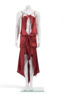 Ruby red, silk satin sleeveless evening dress. Backless to the waist, the dress is constructed from a series of panels and sections that have been pinned, draped, twisted and attached to form the bodice and skirt. The bodice comprises a fabric ribbon neckline from which the front and bra cup panels are attached. The skirt section hangs in generous folds and is caught up and gathered at centre front.