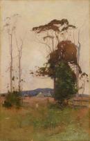 During the late 1890s and the first decade of the twentieth century, Sid Long developed a Symbolist interpretation of the Australian landscape that was largely derived from the English Aesthetic movement and European Art Nouveau. Farm landscape, with its subtle palette and gentle light, shows eucalyptus trees poetically elongated, stylised and silhouetted to form a highly decorative frieze across the picture plane. It reflects Long’s personal interest in developing a visual vocabulary based on the imagination as well as reality.