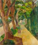 The leafy street is typical of the garden suburb of Turramurra on the North Shore of Sydney, where the artist lived most of her life. In this work Grace Cossington Smith uses one of her favourite compositional devices, a straight path or road that begins at the bottom edge and runs up the canvas to disappear over a rise. The viewer looks up between a cathedral-like frame of tree trunks on the left, branches overhead and solid hedges on the right. For Cossington Smith, a devout Anglican Christian, the spiritual dimension to life was the ultimate meaning behind her art.