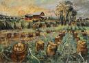 animals (general term) buildings (structures) farms fences (site elements) fields (land) flora (plants) sacks (generic containers) trees