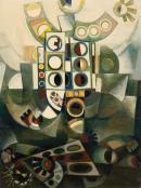As a young man Leonard French worked as a signwriter to support his studio art. When he received the commission in 1963 to make the stained-glass ceiling for the new National Gallery of Victoria designed by Roy Grounds, he became one of the best known artists in the country. Death and transfiguration, with its theme from the gospels, is an early example of his exploration of materials and form. The painting reads as two figures – Christ lying with his head to left, then rising, with arms outstretched, through the top of the canvas.