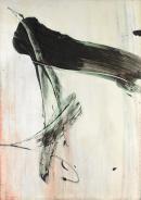 September tablet was painted when Peter Upward was living in an old building in Victoria Street, Potts Point. Situated near Kings Cross, this area was a hub for Sydney’s avant-garde artists of the period, including John Olsen, Stan Rapotec and Clement Meadmore. Working on the floor and painting with broom-size brushes, Upward experimented with enamels and acrylic paints. September tablet is part of a group of gestural calligraphic works executed using a restricted colour palette that Upward produced in the early 1960s, and exemplifies the artist’s fascination with Zen Buddhism and Eastern calligraphy.