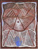 Trevor Nickolls held his first solo exhibition, From Dreamtime to Machinetime in Canberra in 1977. The exhibition title crystallised a central preoccupation of his work, the conflict between Dreamtime – his strong sense of Aboriginal identity, spirituality and affinity with land; and Machinetime – the ambivalent impact of the dominant, colonising culture, and its enticing machines, materialism and technological advancement. In this work, the eye set within the pyramid refers to Egyptian art, and is a symbol embedded with ancient universal alphabets, expressive of Nickolls’s aim to ‘bridge the gap between Western art and Aboriginal art’.