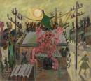 When self-taught artist John Perceval began painting at an early age, he was living in the middle of an experimental period in Australian art. His art was most radical in the early 1940s, when he worked alongside artists, such as Joy Hester, Sidney Nolan, Arthur Boyd and Albert Tucker. This group formed the artist movement known as the Angry Penguins, who redefined art throughout the decade. Boy with a kite, Fitzroy typifies this period for Perceval. The red, feral boy, his animal nature exuding through his monkey feet and hands, grimaces from a childlike mask. The boy rises with his kite, imaginatively levitating over Fitzroy backyards and roofs.
