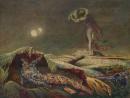 buildings (structures) extraterrestrial bodies grass (plant material) hills men (male humans) moons nudes (representations) women (female humans)