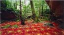 Image of red, floral carpet laid down over a forest floor.