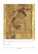 The frame is very simple in construction. It is formed from the mitred assembly of four planks of Californian redwood,1 each plank being 10 ins. wide, with a relieved section forming the frieze panel. The frieze panel is decorated with twigs, leaves and blossoms pinned in place with small flat-head nails.2 The inner and outer raised strips (taeniae) have been gilded. The frieze section, including the decorative work, has been painted gold. The rebate is let into the wide plank and uses a single block centred edge-side on the reverse to add extra security for the painting. The mitred corners are re-enforced on the reverse, with large triangles of timber screwed and glued in place across the joint.