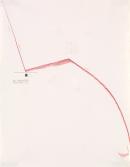 Minimal design of diagonal line from upper left to centre, then sweeping in big clockwise semi-circle across sheet. Black line and marking at centre. On pink sheet.