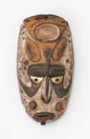 This Yuat River mask is characteristic of masks from the north coast of Papua New Guinea. This example, distinguished by perforation holes along the edge of the mask used to fasten dance costumes worn by dancers in ceremonies. These masks cover the face only while the cloaks made from fibre conceal the rest of the wearer's body. Such mask is part of an impressive dance costume, attached to a conical frame placed over the dancer's head, while a long fibre skirt conceals the body. In ceremonies performed in special ceremonial grounds, the dancers dance to the flickering lights of fire torches accompanied with drums. The dancer is thought to represent or impersonates a clan spirit.