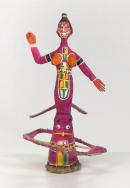 Mask is made of a lattice of narrow beads of pith interwoven with stiff fibre. The bottom of the face consists of a truncated cone or cyclinder with protruberances representing eyes on the stalk, a pierced nose with wooden pieces and ears. The bright pink is unique to the Sulka people which comes from the pith of an elder tree.