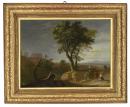 Herman van Swanevelt travelled to Rome in the mid to late 1620s, where he met with great success, receiving several commissions from the Barberini family and the Vatican, among others. Swanevelt’s style developed into an intriguing amalgam of well-observed naturalism in the Dutch manner and Italian classicism. This is especially evident in his highly idealised compositions and use of golden light. The widely travelled Swanevelt influenced an international field of painters, including the great landscape artist Claude Lorrain. In this painting of an impending storm, the family hurrying with a donkey may allude to the biblical story of the Holy Family seeking refuge in Bethlehem.