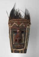 Stylised carved wood mask decorated with feather headdress and shells with a single pig tusk projecting from the centre of the face of mask. The wood mask was said to depict the evil spirit that caused leprosy.