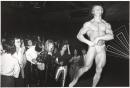 Body-builder flexing muscles with crowd looking on behind.