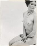 Naked woman kneeling with hands crossed on thighs, wearing elaborate silver necklace.