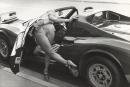 Woman bending into parked Ferrari, wearing short short exposing sheer knickers.