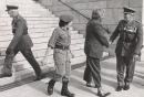 Man shaking hands with Anzac soldier with another man looking on, and a soldier walking away up steps behind.