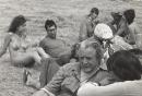 Jim Cairns in foreground, groups of people sitting behind on grass some dressed, some naked.