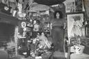 Rotund man standing on souch with a woman sitting next to him, in a room filled with dolls and ornaments and covered with posters.