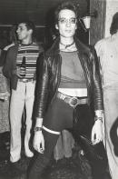 Man standing in nightclub with cigarette in mouth wearing mesh top, leather jacket and two toned pants.