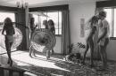 Girl in bikini kissing man under parasol in room. Other girls wearing bikinis and holding parasols standing around.