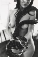 Naked woman with snake wrapped around body.