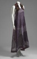 Halter neck style evening dress in aubergine cotton with digital printed motif at clustered beads. The detachable halter is heavily embroidered with beads, sequins four pearls on a cotton ground over a suede leather strap. The dress wraps in a curved panel from front to back. The back is open, joining at the waist to form a bridal like train detail. Inside second fabric layer with the same digital print on white silk ground forms the lining and is stitched to the front in wide quilt seams. The hemline features bands of decorative top stitching. The halter neck joins to the front bodice at either side with leather ties threaded through the front two gold coloured metal eyelets.