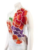 White cotton rib woman's singlet decorated with applique panel featuring large red, purple and pink flowers in silk embroidery. The panel is stitched to the singlet by bands of running stitch in brown cotton thread which follow the line of the singlet itself.