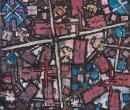 Square format, large scale woven wool and cotton tapestry in a palette of twilight pink, cobalt blue, white, navy and red shades. Across the face of the tapestry are featured bold circular and square abstract geometric forms and stipples of colours with a central cruciform motif in white. The lower right corner has the VTW signature woven in blue wool. The rear of the panel has a horizontal strip of Velcro across the top edge for hanging.