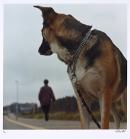Image of a dog looking over its shoulder at a person walking into the distance.